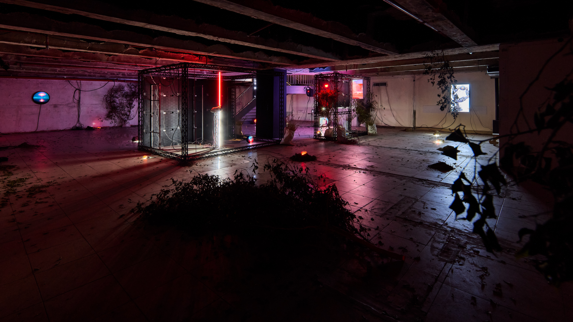 A looped soundtrack, a mechanized underground night club. The sound translates into pulses of light, between space and vapor. Mechanical dance forms are automated between machines. The installation breaks down a nightclub experience into pixel and fog, the sound channels into light triggers in a compressed underground bomb shelter.